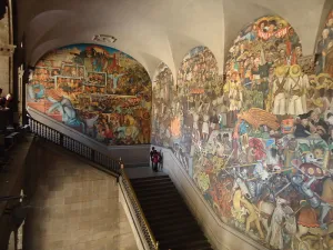Der mexikanische Künster Diego Rivera malte zwischen 1929-1943 verschiedene Ausschnitte aus der Geschichte Mexikos auf die Wände staatlicher Gebäude in Mexiko. Sie wurden im Laufe der Präsentation gezeigt und erklärt, um anschließend noch Themen anzusprechen, mit denen sich Rivera wahrscheinlich auseinandersetzen würde, wäre er noch am Leben: Zum einen das Massaker von Ayozinapa. Das Verschwinden von 43 Studenden machte der mexikanischen Gesellschaft deutlich, wie verwickelt die staatlichen Institutionen und die Politik mit der Kriminalität, den Drogenmafias y Gangs sind. Und zum anderen die illegale Emigration in den Norden, die lebensgefährlich ist.