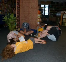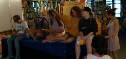 Im Hof der Stadtbibliothek las der Jugendleseclub aus Train Kids ununterbrochen vor. In gemütlicher Atmosphäre beendeten die Jugendlichen die Aktionen zum Buch - allerdings nur für den Sommer.
