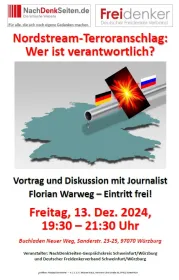 Am 26.09.2022 zerstörten Sprengsätze in der Ostsee drei der vier Nordstream-Gasröhren zwischen Deutschland und Russland. Bis heute wird über die Verantwortlichen für diesen Terroranschlag auf die kritische Energieinfrastruktur Deutschlands und Europas gerätselt. Florian Warweg, Journalist und Korrespondent der NachDenkSeiten bei der Bundespressekonferenz, berichtet über die aktuelle Faktenlage, bisher kaum bekannte Hintergründe und mit wie wenig Aufklärungsinteresse dieses Thema auf der Bundespressekonferenz behandelt wird.