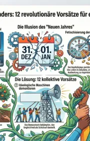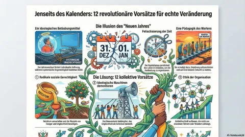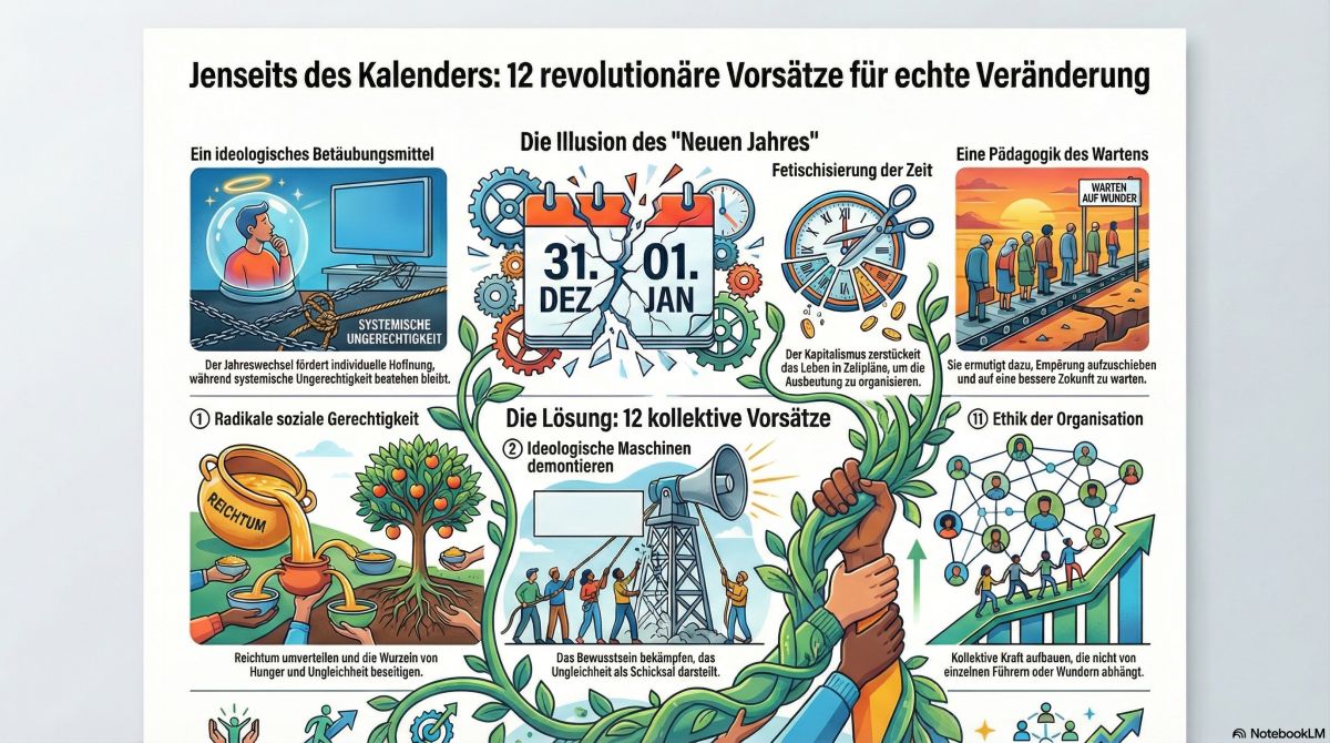 Dieses Dokument fasst die zentralen Argumente eines philosophischen Essays von Fernando Buen Abad Domínguez sowie den umgebenden geopolitischen Kontext zusammen, der in einer Reihe von Nachrichtenmeldungen von Ende 2025 und Anfang 2026 dargestellt wird. Die Analyse ist zweigeteilt: Zuerst wird die ideologiekritische Auseinandersetzung des Autors mit dem Konzept des „Neujahrs“ als Werkzeug des Kapitalismus zur Aufrechterhaltung des Status quo beleuchtet. Anschließend werden diese philosophischen Überlegungen in den Kontext einer schweren internationalen Krise gestellt, die eine militärische Intervention der USA in Venezuela unter der Führung von Donald Trump und die Gefangennahme von Präsident Nicolás Maduro umfasst.