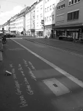 Hier findet man den Buchladen Neuer Weg, wo der Jugendleseclub Lesezeichen beheimatet ist. Die Jugendlichen des Leseclubs hatten am Freitag, den 23. Juli, mit mehreren Eimern Straßenkreide ausgerüstet, besondere Zitate bzw. erste Sätze aus Jugendbüchern und auch eigene Gedichte auf die Bürgersteige geschrieben. Ihre Hoffnung: Leute neugierig machen. Ihre Ambition: Zeigen, wie literarisch Jugendliteratur sein kann - und natürlich auf die Buchhandlung aufmerksam machen.