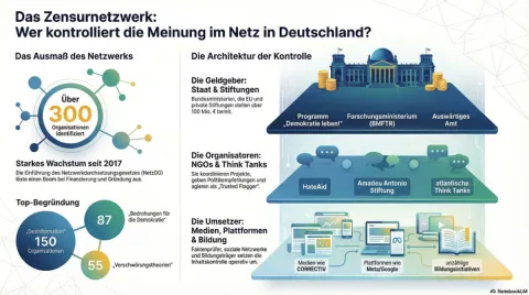 Dieses Briefing-Dokument fasst die Ergebnisse des Berichts „Das Zensurnetzwerk: Regulierung und Repression im heutigen Deutschland“ zusammen. Die zentrale Erkenntnis ist die Existenz eines weitreichenden, koordinierten Netzwerks von über 300 Organisationen in Deutschland, das darauf abzielt, die Online-Meinungsäußerung zu überwachen und zu unterdrücken. Diese Aktivitäten erfolgen häufig unter dem Deckmantel der „Bekämpfung von Desinformation“ oder „Hassrede“.