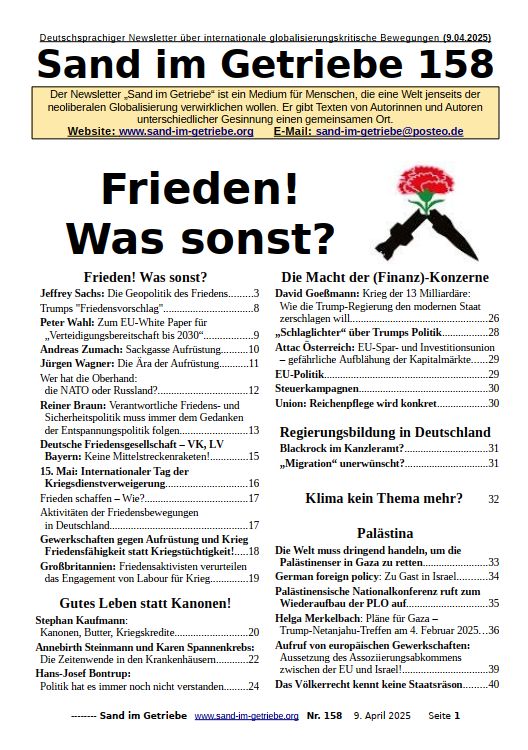 Bei allen lebensbedrohenden Entwicklungen (Kriege wie sozialer Abbau wie Umweltzerstörungen) sitzen wir nicht am längeren Hebel – Also müssen wir, nach den Gesetzen der Physik, viele, sehr viele werden, die international solidarisch, konzertiert und klug vorgehen. (mdv)
