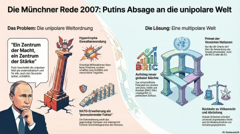 Dieses Dokument fasst die zentralen Thesen und Argumente der Rede von Präsident Wladimir Putin auf der 43. Münchner Sicherheitskonferenz im Jahr 2007 zusammen. Die Rede stellt eine fundamentale Kritik an der nach dem Kalten Krieg entstandenen globalen Ordnung dar, die Putin als ein gescheitertes unipolares Modell unter der Führung der Vereinigten Staaten charakterisiert.