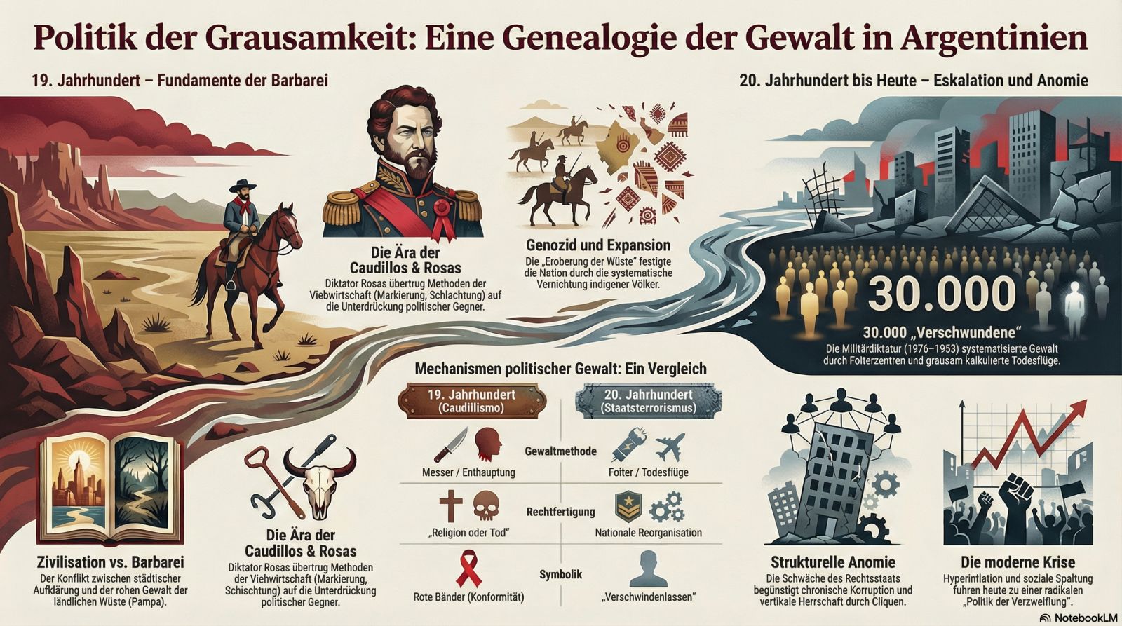 Dieses Dokument synthetisiert die zentralen Thesen aus Wolfgang R. Heuers Analyse der argentinischen Geschichte, die eine tief verwurzelte Kontinuität struktureller Gewalt und politischer Instabilität aufzeigt. Die Kernthese besagt, dass die gegenwärtigen Krisen Argentiniens – von ökonomischer Dauerkrise und systemischer Korruption bis hin zu gesellschaftlicher Zerrissenheit – nicht isoliert betrachtet werden können, sondern das Ergebnis einer langen historischen Entwicklung sind. Diese „Genealogie der Gewalt“ reicht von den anarchischen Bürgerkriegen des 19. Jahrhunderts, geprägt durch die Herrschaft der Caudillos und eine Kultur der Grausamkeit, über die genozidale Expansion in Patagonien bis hin zu den Militärdiktaturen und dem Staatsterrorismus des 20. Jahrhunderts.