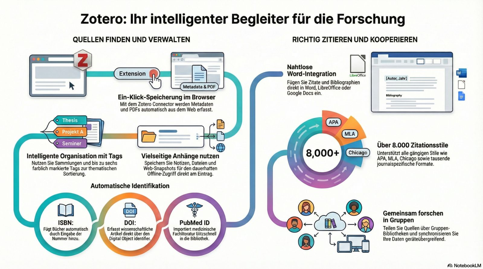 Mit dem Verständnis dieser Kernfunktionen – vom Sammeln und Organisieren über das Zitieren bis hin zur Kollaboration – sind Sie nun bestens gerüstet, um Zotero als zentrales Werkzeug für Ihre wissenschaftliche Arbeit zu nutzen und Ihren Forschungsprozess nachhaltig zu optimieren.