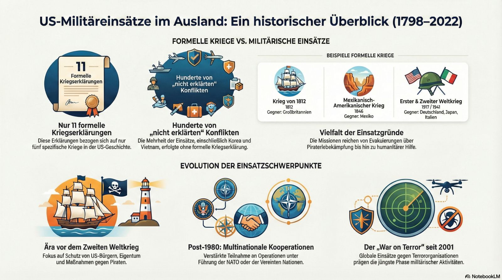 • Rechtliche Autorisierung: In der gesamten US-Geschichte gab es lediglich elf formale Kriegserklärungen, die sich auf fünf Kriege verteilen. Die Mehrheit der militärischen Aktivitäten erfolgte durch gesetzliche Autorisierungen, die Befugnisse des Präsidenten als Oberbefehlshaber oder im Rahmen von UN- und NATO-Mandaten.