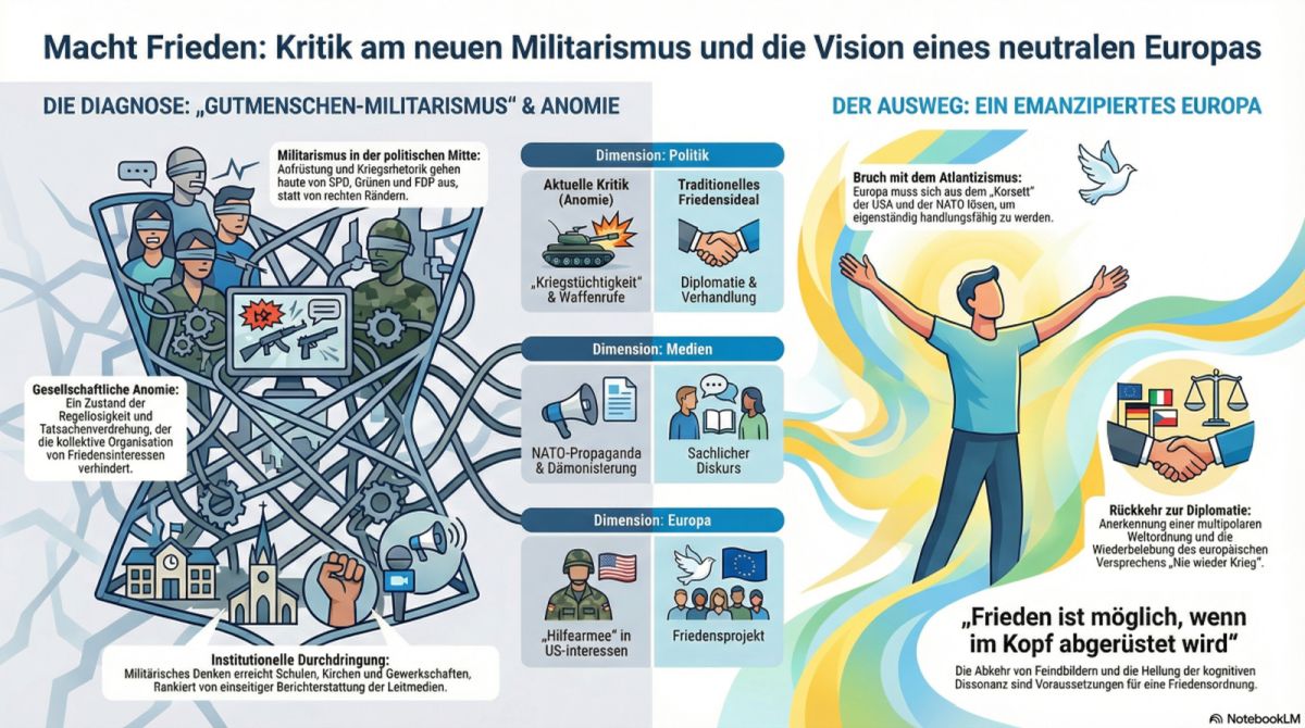 Das vorliegende Dokument synthetisiert die Kernpunkte einer Rede von Prof. Dr. Ulrike Guérot, die am 14. Februar 2026 auf dem Münchener Odeonsplatz gehalten wurde. Die zentrale These der Rede ist eine tiefgreifende Warnung vor einem neuen, in der „politischen Mitte“ verankerten Militarismus, der die Grundfesten der europäischen Friedensordnung und die demokratische Urteilskraft bedroht.