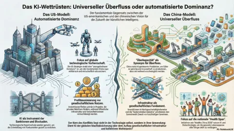 Dieses Briefing analysiert die tiefgreifenden geopolitischen und sozioökonomischen Implikationen des aktuellen Wettlaufs um die Künstliche Intelligenz (KI) zwischen den USA und China. Während westliche Akteure KI primär als Werkzeug zur Sicherung „unangefochtener globaler technologischer Dominanz“ betrachten, wird das chinesische Modell als ein System der „Abundanz“ (Überfluss) dargestellt, das darauf abzielt, gesellschaftliche Infrastruktur und Lebensstandards global zu heben.