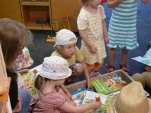 Sandra Büx, die mit ihrer Kollegin die Kinder begleitet, freut sich und ist auch ein bisschen stolz auf ihre Kinder, die so interessiert an den Büchern sind. Sie wird mit ihrem Team 2 Wochen den Inhalt des Koffers nutzen, um ihn dann an denKindergarten St. Gabriel weiterzugeben. Das Kinderhaus der AWO in Veitshöchheim, das Kinderhaus Sonnenblume in Lengfeld, das Campus Kinderhaus am Hubland und die Kita St. Hildegard sind ebenfalls an der Aktion beteiligt.Der Buchladen Neuer Weg, der sich intensiv für die Leseförderung in und um Würzburg einsetzt und die Verlage der Oetinger Gruppe und Ravensburger machen es möglich: Durch ihre Initiative kam dieses Projekt ins Rollen.
