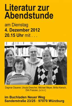 Die Veranstaltung am 4.12.2012 war wie jedes Jahr, gut besucht und den Besuchern hat's gefallen. Als Dankeschön wollen wir die besprochenen Bücher hier sukzessive einstellen. Anhand der ->Tags läßt sich nachvollziehen, von wem die jeweilige Buchempfehlung stammt. Hier die Auflösung: