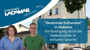 Dieses Video ist Teil einer zwei·teiligen Video·reihe über die Verbrechen der National·sozialisten in der ehemaligen Landes·heil·anstalt Hadamar. Dabei erklären die Sprecherin und der Sprecher die Hinter·gründe und Abläufe der national·sozialistischen Mord·aktion in Hadamar zwischen 1942 und 1945. Sie beleuchten auch die von den Morden betroffenen Menschen und deren Familien.