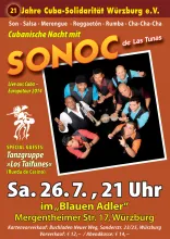 "Die Cubanische Nacht ist ein Solidaritätsfest. Der Erlös fließt in unser neues Projekt: Solare Bewässerung von Gemüsegärten für über 4.000 Kinder in Havanna. Zum Datum: am 26. Juli jährt sich zum 61. Mal der Angriff auf die Moncada-Kaserne in Santiago de Cuba. Dieses Ereignis (am 26. Juli 1953) ist der Beginn der Kubanischen Revolution." Cuba-Solidarität Würzburg e.V.